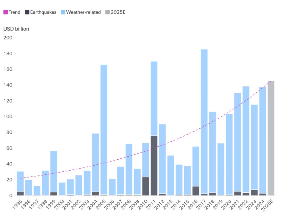El Swiss Re Institute pronostica que, si las pérdidas aseguradas globales por catástrofes naturales siguen la tendencia de los últimos años de crecer entre 5 y 7% anual en términos reales, las pérdidas aseguradas se acercarán a los $145,000 millones de dólares al finalizar 2025.