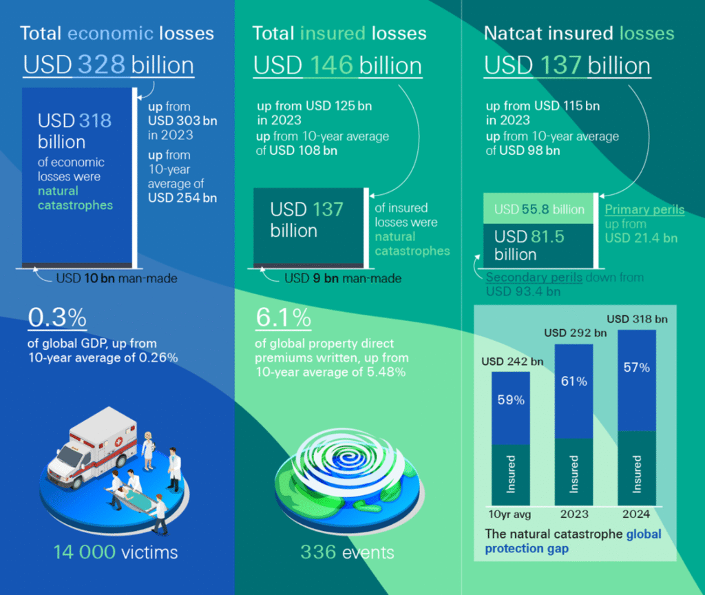 Hay que tomar en cuenta que, según el Swiss Re Institute, en 2024, las catástrofes naturales provocaron pérdidas por $318,000 millones de dólares, pero solo $137,000 millones estaban asegurados, dejando una brecha de protección de más de $180,00 millones. Los desastres que más pérdidas arrojaron fueron los huracanes Helene y Milton, las tormentas convectivas severas en los Estados Unidos, las inundaciones catastróficas en todo el mundo y las pérdidas aseguradas por catástrofes naturales más altas jamás registradas en Canadá.